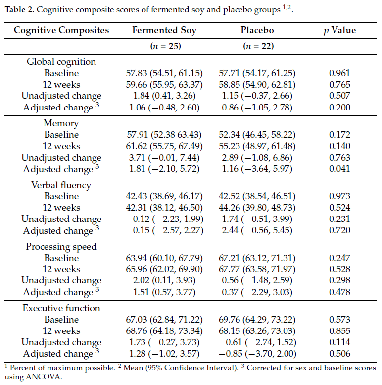 表2:发酵大豆组和安慰剂组的认知综合评分1,2。