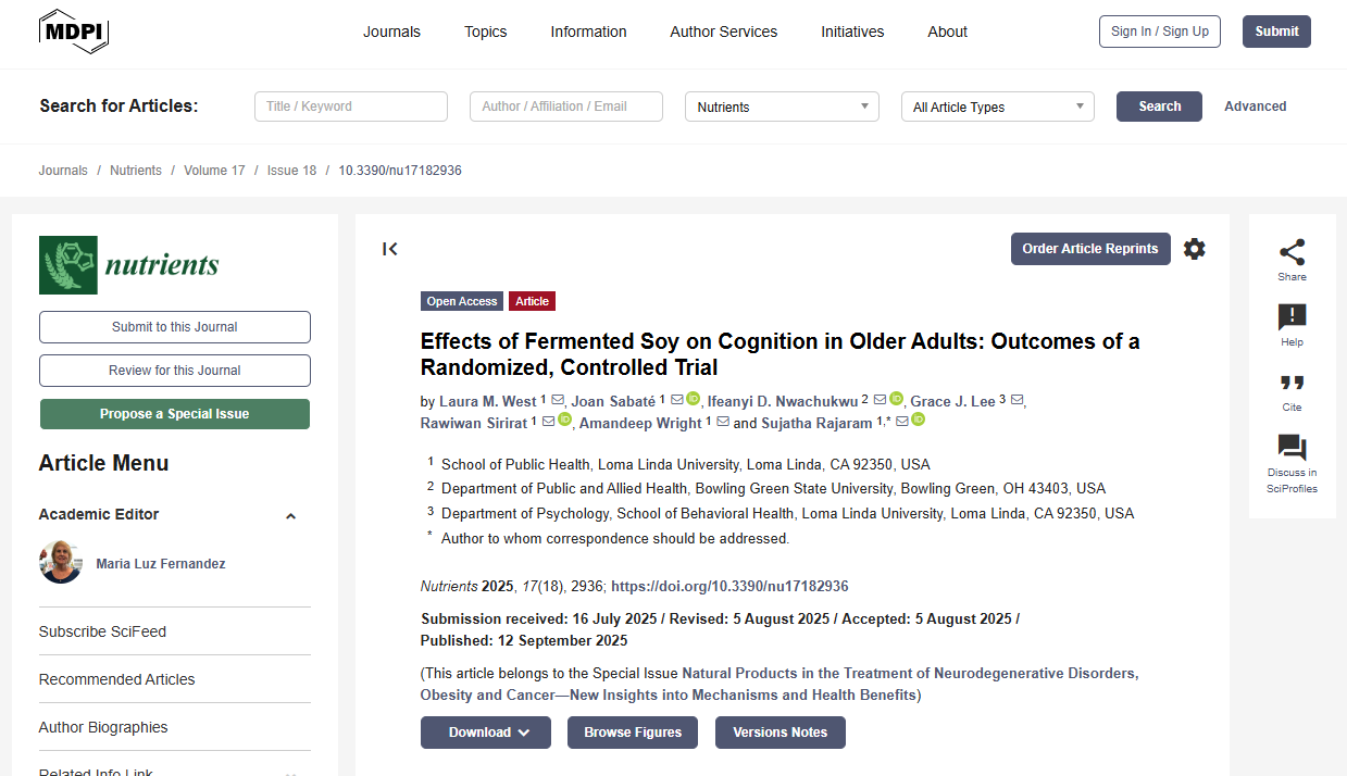 记忆对日常决策和功能至关重要,因此定期摄入发酵大豆可能是延缓认知衰退的一种经济有效的方法。由于之前的研究支持Q-Can Plus®的降胆固醇、抗氧化、抗炎和肠道健康作用,因此有可能考虑将发酵大豆作为饮食的一部分,以保护心脏健康和认知。