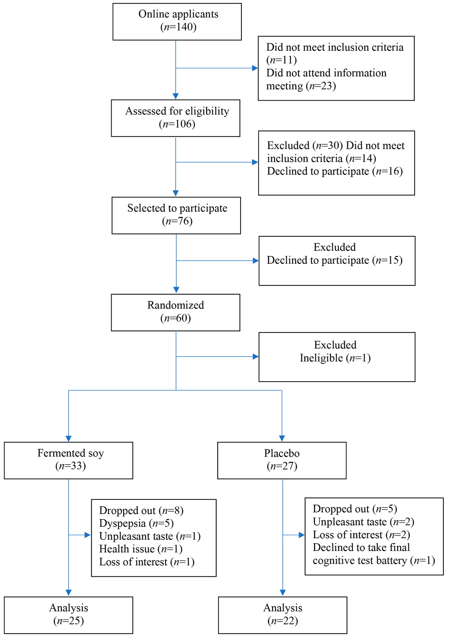 140人申请参加研究,106人进行了资格评估,其中76人获选参加。63个合格,个人同意参与研究,其中两人拒绝完成认知测试电池。其余61名参与者被随机分为两组,发酵大豆组(n=33)和对照组(n=28)。计算样本量对于其他主要结果,免疫标记物(包括10%的退出率)为:估计为62。