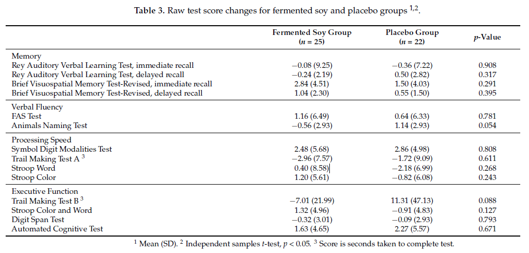 表3:发酵大豆和安慰剂组1,2的原始测试分数变化
