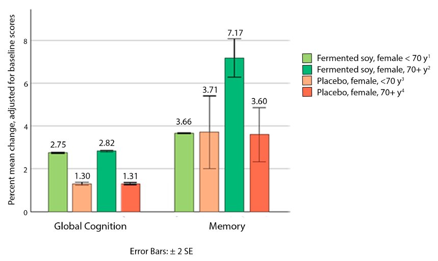 在这项为期12周的随机对照饮食干预研究中,调查了每天食用发酵豆制品对老年人认知能力的影响,观察到记忆领域有了适度但显著的改善。在探索性分析中,70岁及以上的绝经后妇女的记忆得分改善更为显著(发酵大豆组平均改善8.47%,安慰剂组平均改善2.05%)。为了进行比较,希腊的一项研究检查了老年人言语记忆得分的规范性数据,发现70-79岁年龄组的平均得分比60-69岁年龄组低6.1%至9.6%。我们的结果是探索性的,在进行确证性试验之前应谨慎解释。