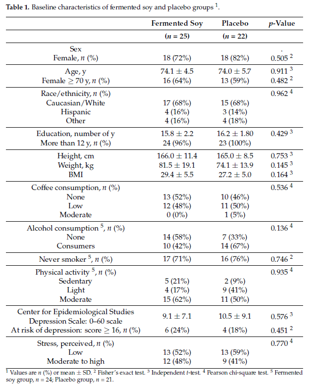 在61名随机受试者中,大多数(n=29)是70岁及以上的绝经后妇女。随机分为安慰剂组的一名受试者最近被诊断为MCI,因此不再有资格参加。发酵大豆组的8名参与者和安慰剂组的5名参与者在最后的认知测试前退出。在发酵大豆组中,5人因消化不良而退出,1人因干预产品味道不好、与干预无关的健康问题以及对研究失去兴趣而退出。在对照组中,两名参与者因安慰剂产品的不愉快味道而退出,两名参与者因对研究失去兴趣而退出,另一名参与者因拒绝参加最后的认知测试而退出。总体辍学率为22%,这与其他老年人营养干预试验一致[45,46]。磨蚀的原因主要和干预的适口性有关。47名参与者完成了研究:发酵大豆组25名,对照组22名。完成者平均年龄74.0岁,辍学者平均年龄71.7岁,差异无统计学意义(p=0.148)。退出的13名参与者中有6名年龄<70岁。与白人和其他种族群体相比,拉美裔辍学的人数明显更多(p=0.013)。完成研究者和辍学者在所有其他方面都相似(补充表S1)。